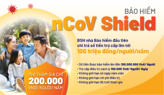 Tổng Công ty Bảo hiểm Sài Gòn – Hà Nội (BSH) đã đưa ra chương trình bảo hiểm nCoV Shield. Phí tham gia là 200.000 đồng/ người/ năm với số tiền được bảo hiểm là 100 triệu đồng/ người, có hiệu lực ngay sau khi khách hàng hoàn tất mua sản phẩm. Bảo hiểm nCoV Shield có những ưu điểm đặc biệt, đầu tiên và duy nhất trên thị trường hiện nay như không giới hạn độ tuổi tham gia, không giới hạn chi trả phí điều trị/ ngày nằm viện, không giới hạn số ngày nằm viện. Đối tượng tham gia không chỉ là công dân Việt Nam mà còn cho cả người nước ngoài đang sinh sống và làm việc tại Việt Nam. nCoV Shield cũng hỗ trợ 100.000 đồng/ người/ngày cho các khách hàng trong thời gian điều trị tại khu cách ly. Hiện nay, nCoV Shield được BSH triển khai bán trên toàn quốc.